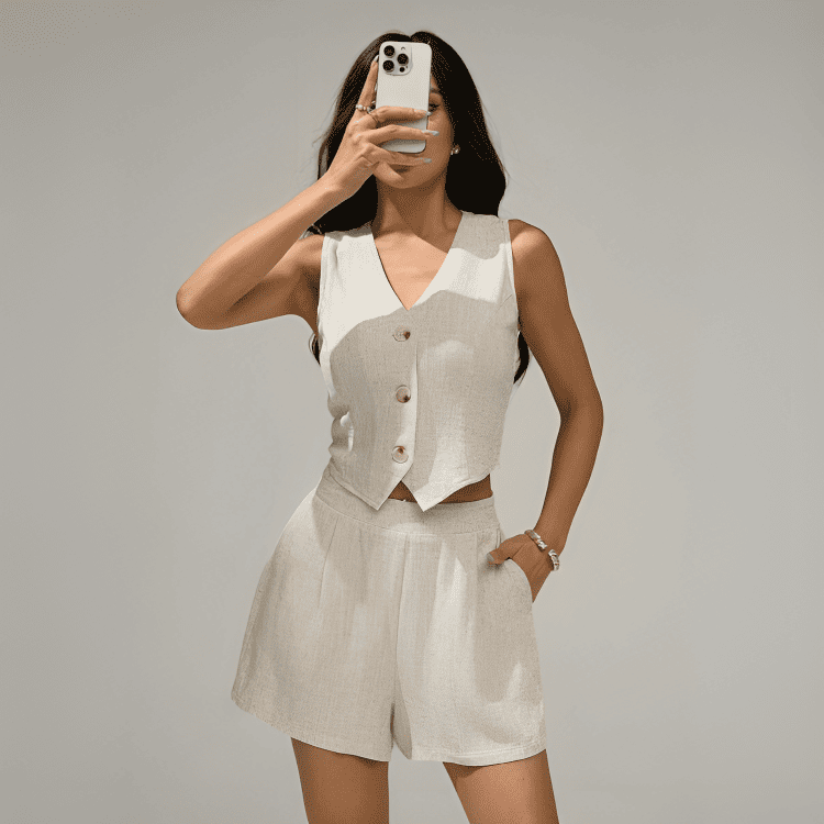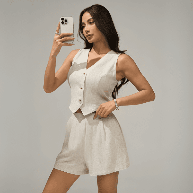 Picture yourself at an outdoor cafe, on a sunset stroll, or at a special gathering, feeling confident and radiant. The combination of the structured vest and the flowy shorts creates a visual harmony that’s both sophisticated and completely fuss-free.
