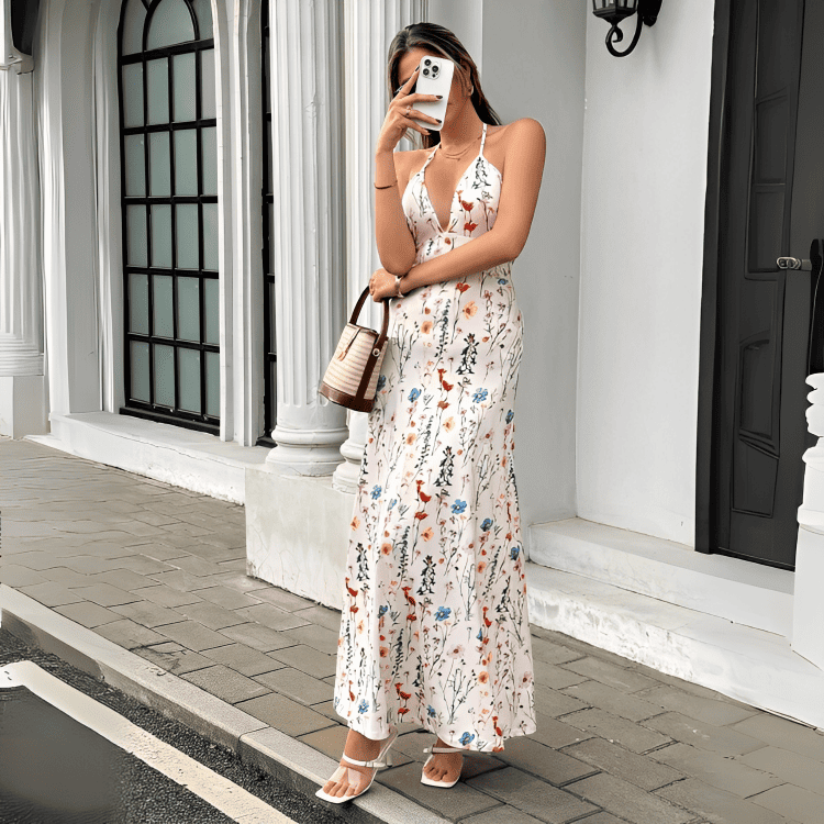 The halter neckline flatters your shoulders and décolletage, while the open back with its criss-cross ties is an invitation to feel the warm summer breeze. A high waist defines the silhouette before giving way to a long, flowing skirt that dances with your every step, creating a mesmerizing sway whether you're walking on the sand or dancing under the stars.