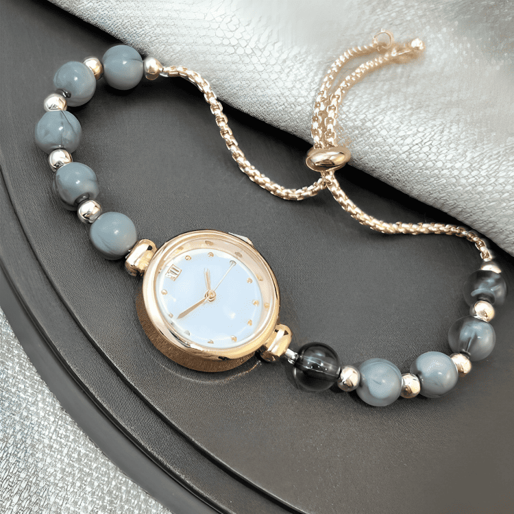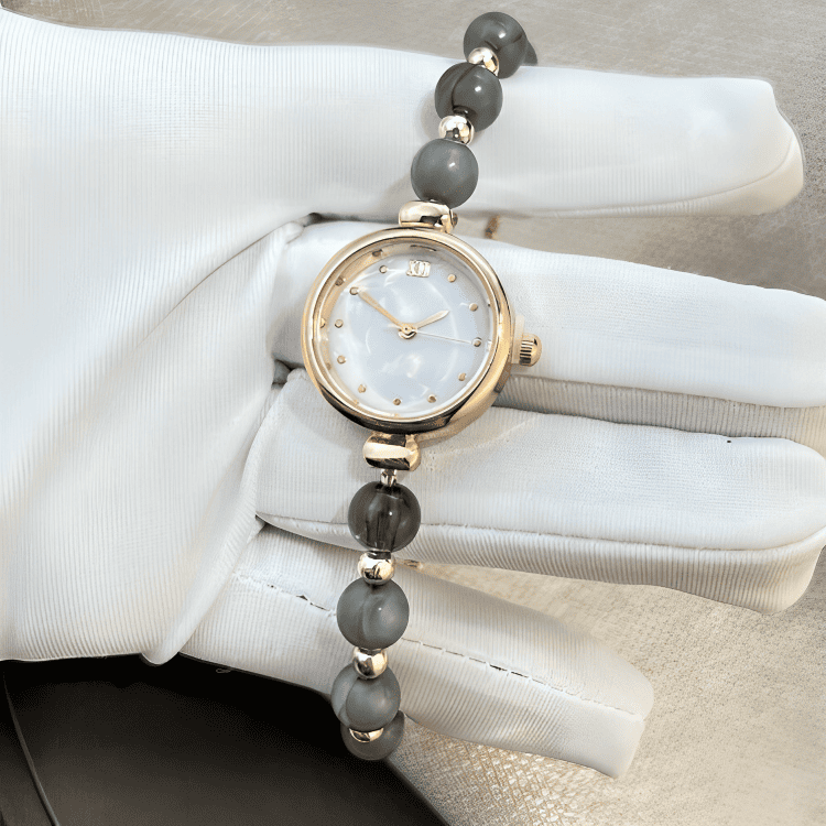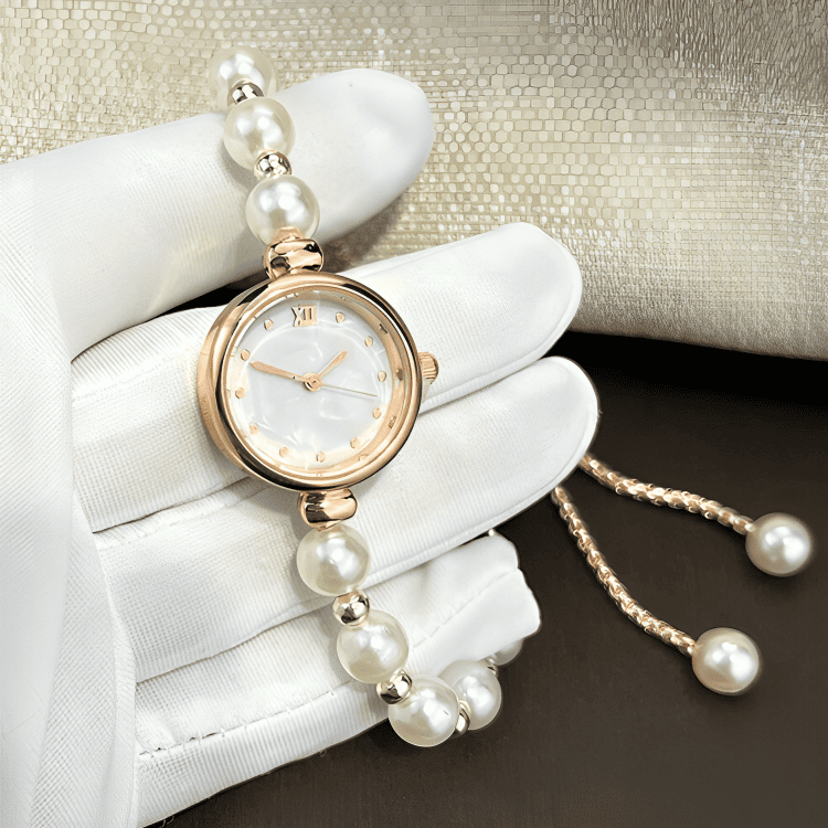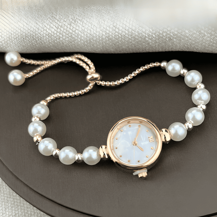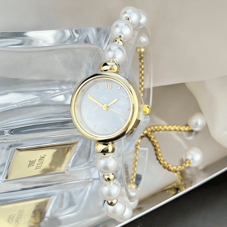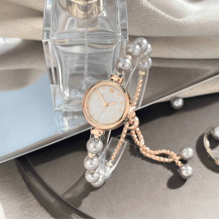 Like a strand of pearls blooming on the wrist, each bead is selected to reflect a soft, natural luster. The mother-of-pearl dial, a shimmering fragment of the ocean, sets the stage for time to dance. The round case and gold-toned details are the calyx holding this rare flower, while the adjustable clasp ensures its beauty molds perfectly to you.